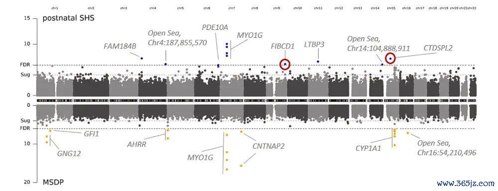 孩子生存在有东说念主抽烟的家庭里,会在基因调控层面留住11个明确的“烟雾萍踪”。这些点在图中的上半部分以蓝点的格式凸起自满,其中两个是科学界从未见过的新标识。下半部分的橙点是全球熟识的孕期抽烟带来的变化,用来说明分析是可靠的。这张基因舆图得以让咱们直不雅地看到烟雾在孩子体内留住的萍踪在那边。